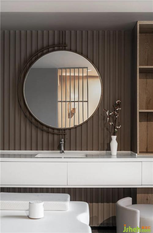 衛(wèi)生間的鏡面對(duì)應(yīng)空間景觀節(jié)點(diǎn),將室外景觀直接引入小空間上海會(huì)所設(shè)計(jì)。適當(dāng)“借景”帶來(lái)更加豐富的空間體驗(yàn)。