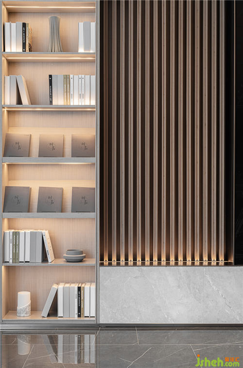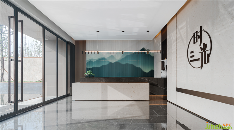 橫平豎直的線條擁有理性的、凝固的力量,大理石的接待臺與鑲嵌“時光”二字的隔斷墻體便是如此。連續(xù)的豎線隨綠意層層點染開來,表現山水畫的氤氳之美。