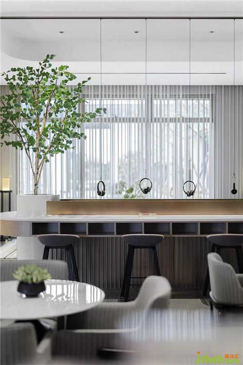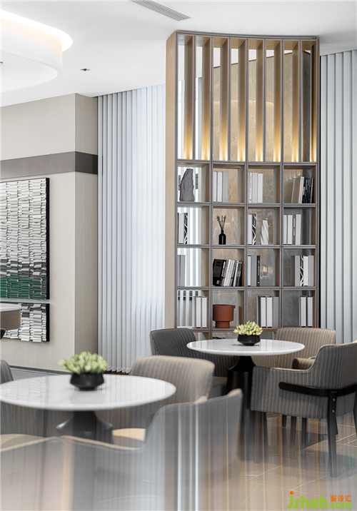 設計師在直線條的基礎上,引入新的體塊造型元素和軟裝陳設,為洽談區(qū)塑造更多的功能面貌,突破了傳統(tǒng)洽談區(qū)的單調,使人眼前一亮。