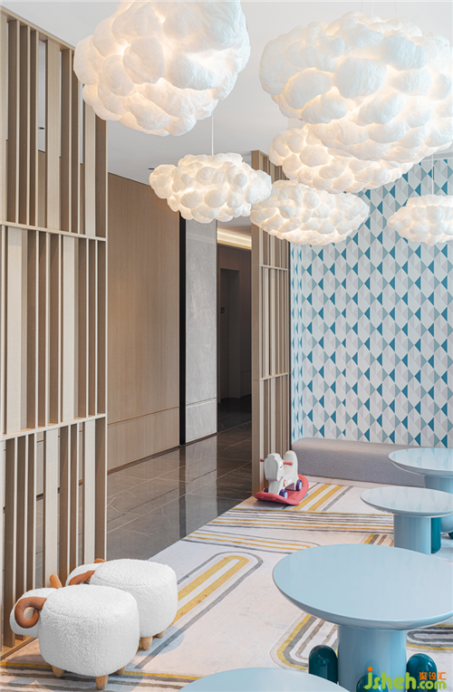 狹長(zhǎng)的過道也被合理利用起來。引用被抬高的地臺(tái)和通高的格柵,兒童區(qū)的色彩在綿軟的云朵里顯得清新可愛,矮墩單椅和玩具為孩童帶來無窮的想象空間。