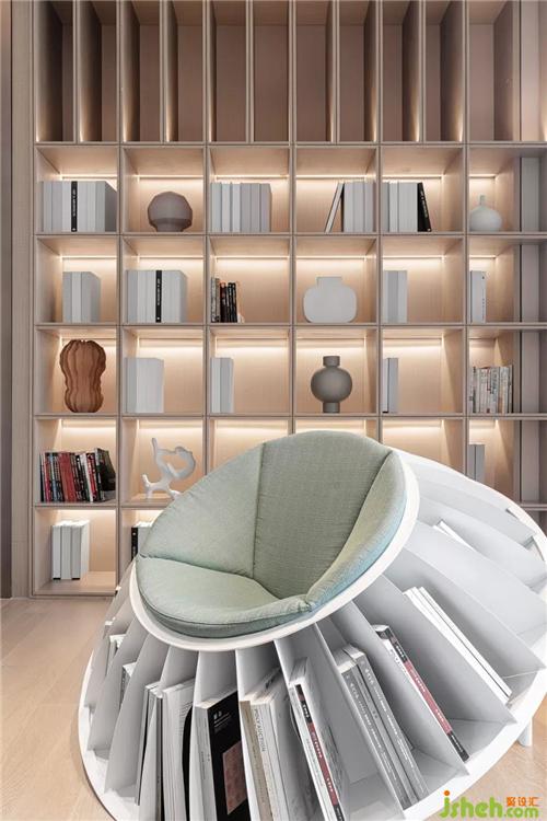 鄰近的書吧延續(xù)清新的配色,造型獨(dú)特的向日葵沙發(fā)單椅富有生趣,錯(cuò)落的書格則存放著體味閑暇的心情。閱讀,能跨越時(shí)間,使我們通過翻動(dòng)的書頁,完成與有趣靈魂的共鳴。