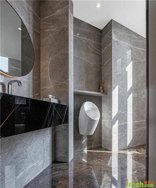 不銹鋼的天花、不規(guī)則的掛飾、不平滑的墻面,粗糲斑駁的大理石,過(guò)道空間同樣點(diǎn)題。細(xì)長(zhǎng)的地?zé)魺魩缤窐?biāo),延展指引到另一重截然不同的空間。