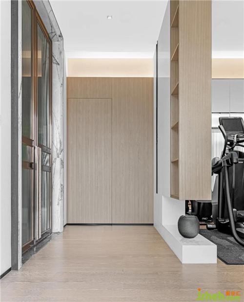 下層的健身房書吧采用大量的木飾面和白色大理石作為色彩基調(diào),顯得舒緩、溫馨而且明亮。沿著動(dòng)靜結(jié)合的思路,以空間盡頭的Mini餐吧為中軸,運(yùn)動(dòng)區(qū)和閱讀區(qū)平分秋色,創(chuàng)造一個(gè)滿滿人氣的放松好去處。
