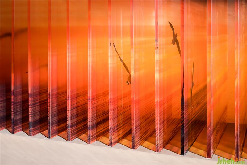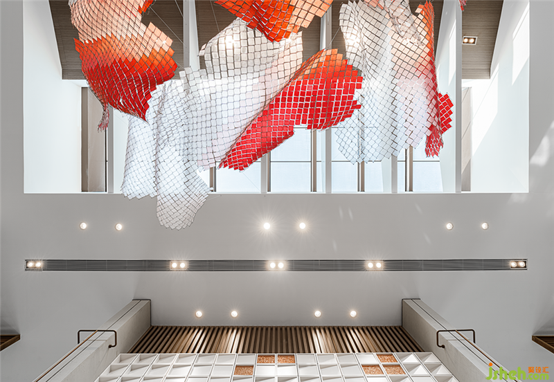 沙盤上方的藝術(shù)裝置,造型似鳳翅,如揚(yáng)起光輝的太陽,以傾身飛翔之態(tài),扶搖直上。紅白雙色映襯間,與傳統(tǒng)的丹鳳朝陽元素遙相呼應(yīng)。皎若旭日,軒然霞舉。