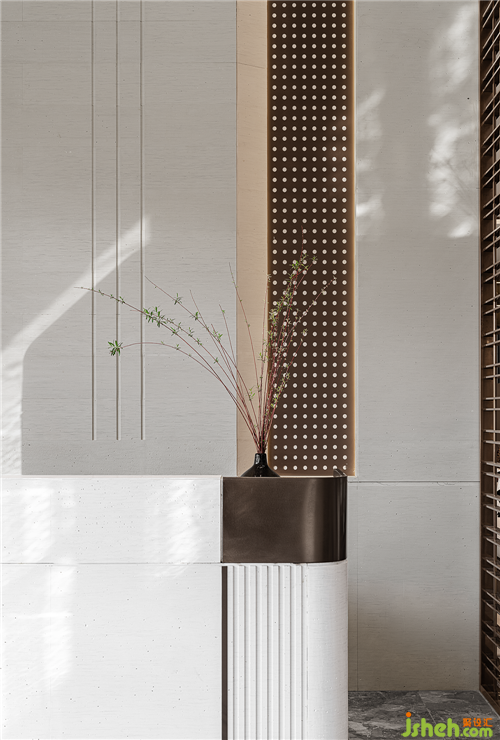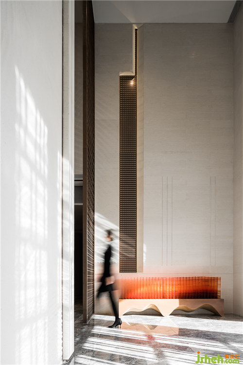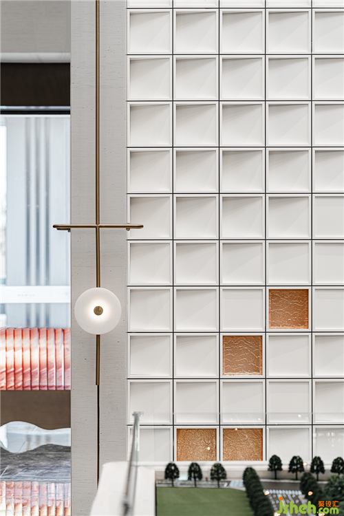 墻面藝術(shù)裝置則從Marcello Morandini的藝術(shù)作品演變而來,由明至暗,在方格間對光影進(jìn)行剪裁,運(yùn)用自然光線的明暗關(guān)系層層遞進(jìn),視覺上呈現(xiàn)出“看花非花,看花是花”的韻律感。在墻面的縱橫方格間,使光線如水波一般流動,盡顯柔和朦朧的美感。