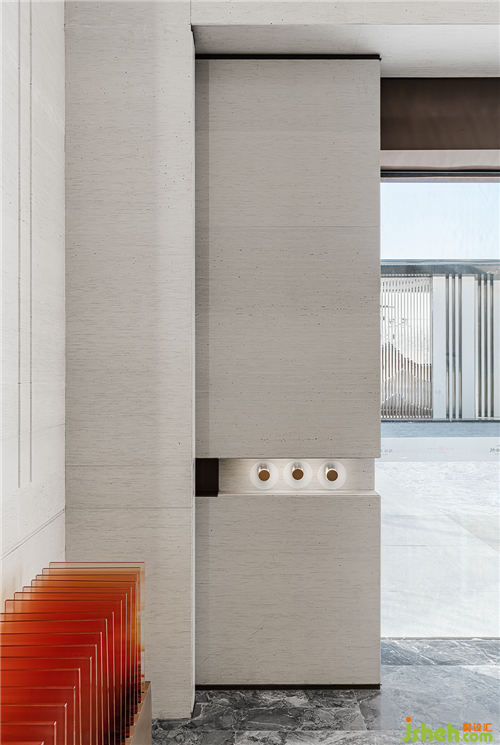 接待序廳采用開敞式空間,以對稱美感,致敬中國禮序思想;大面積米灰色系石材中穿插棱角分明的鏤空不銹鋼,北京售樓處設(shè)計(jì)銅質(zhì)壁燈點(diǎn)亮空間,定制故宮紅藝術(shù)裝置,硬朗的線條點(diǎn)綴柔和而端雅的宮燈紅,仿佛是在與時間對話,無言訴說前世今生的承續(xù)。