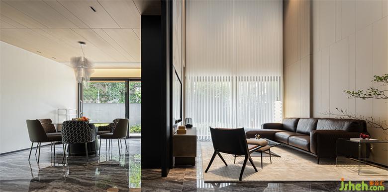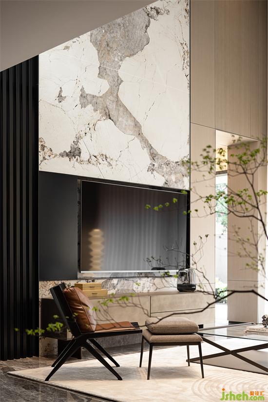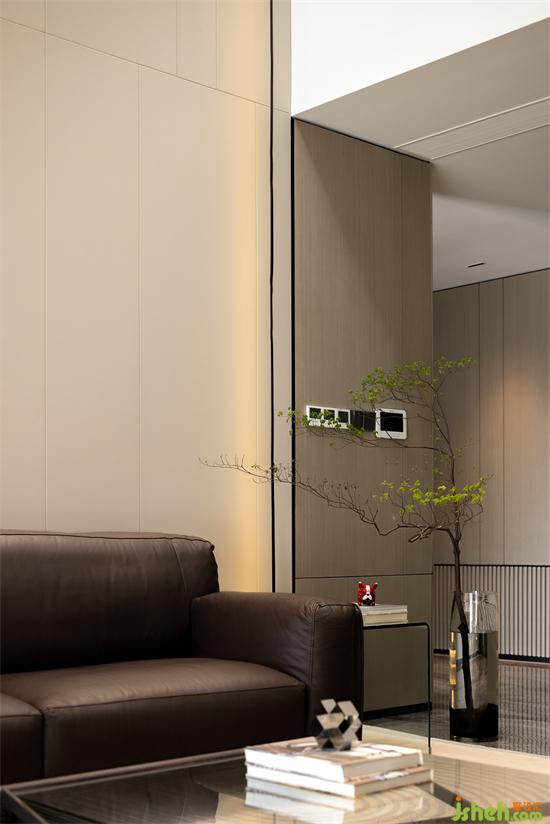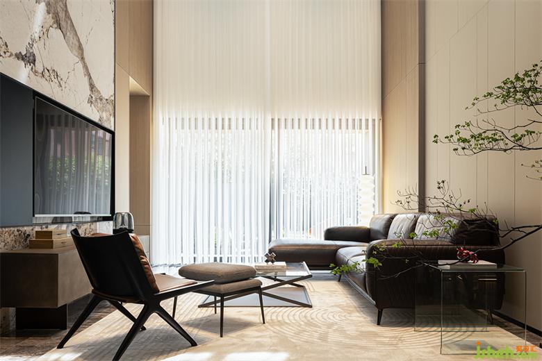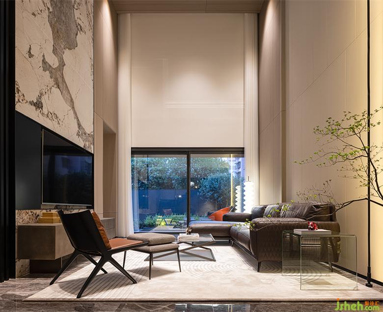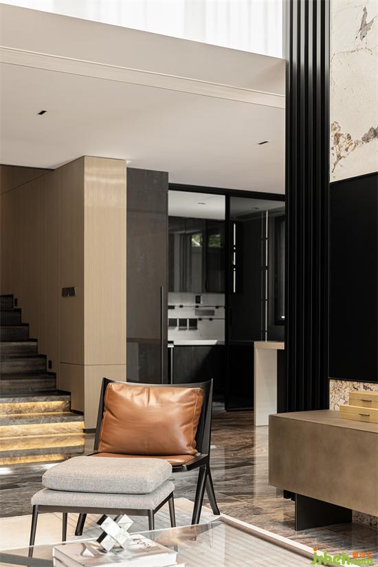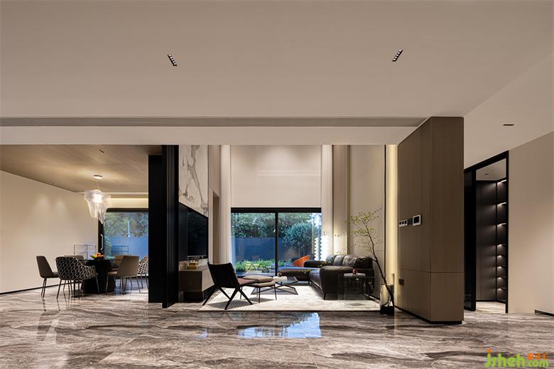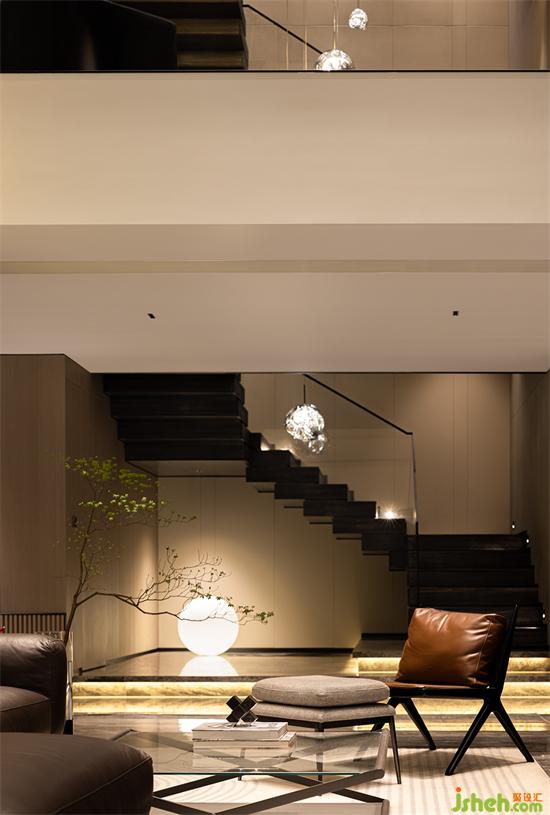 大面積的落地窗,現(xiàn)代別墅裝修設(shè)計引入窗外的自然氣韻。自然光與室內(nèi)燈光相結(jié)合,各個時段的陽光以不同的角度照射進(jìn)室內(nèi),留痕于沙發(fā)、地毯、茶幾上,光影變幻中,呈現(xiàn)出安寧靜謐的視覺畫面。