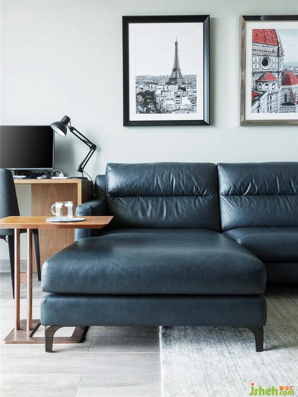 超長的真皮沙發(fā),造型簡單輕薄,很富有經典的德國設計風格,建筑圖案的裝飾畫并不會顯得太過搶眼,有一種安靜協調感,你會覺得它本來就應該在這里,他屬于這個空間。