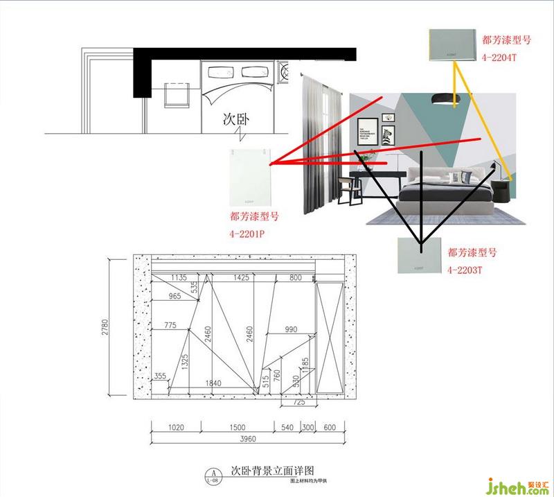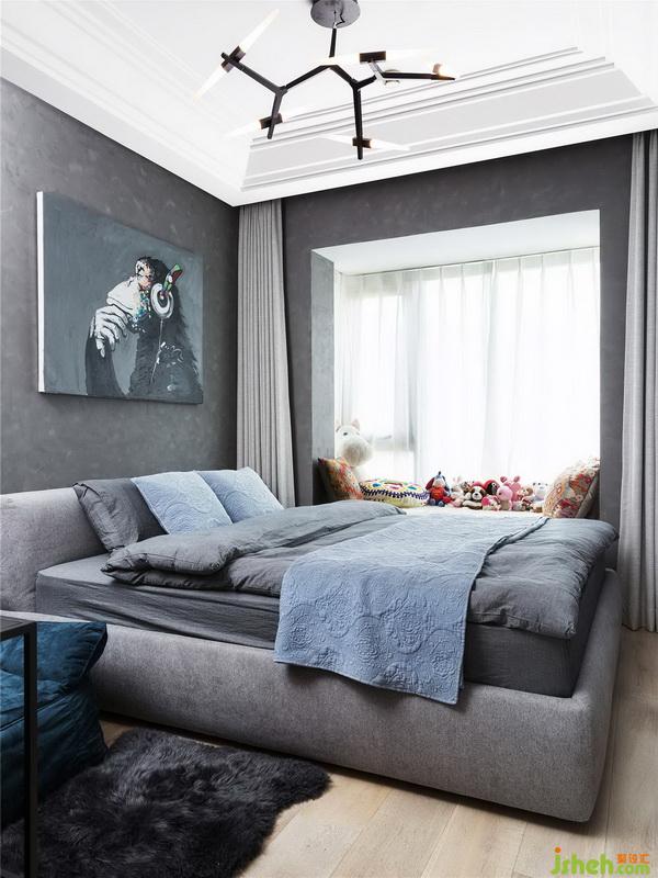 次臥背景墻用幾何色塊打破單調(diào)氛圍,床品依舊是香芋色為主,點(diǎn)綴黃色。