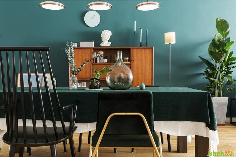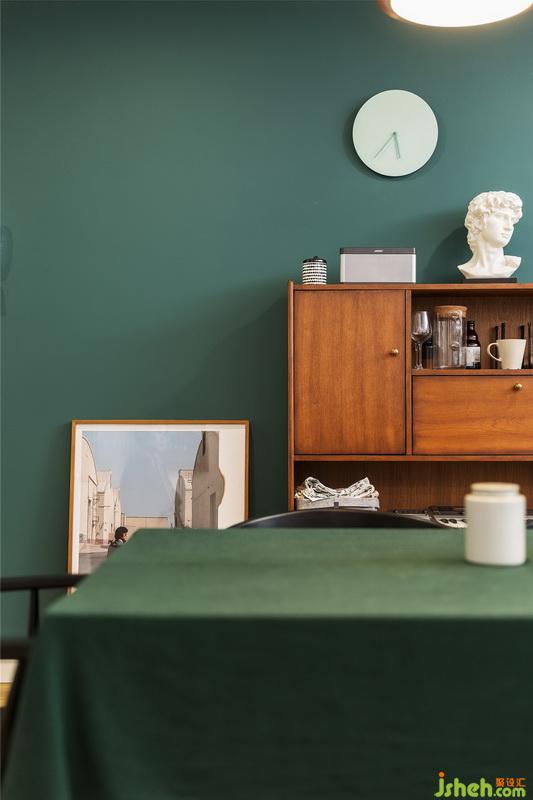 藍(lán)綠色圓形小掛鐘跟墨綠色的背景墻形成絕佳視覺體驗(yàn),同屬于綠色系,色度的遞進(jìn)即不會(huì)減弱背景的存在感,也突出了掛鐘的點(diǎn)睛存在,大衛(wèi)石膏增加一份復(fù)古文藝氣息。