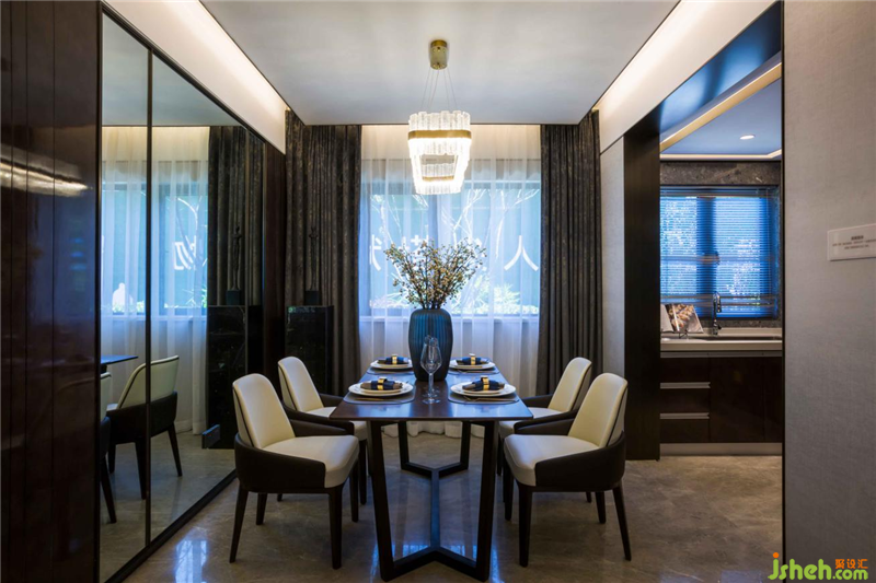 大理石地面搭配背景墻鏡面,讓整個空間更加寬廣,簡雅的素色餐椅搭配白色餐椅,令餐廳空間安靜溫潤。金屬黃銅燈具的點綴,質(zhì)樸而不失現(xiàn)代美感。