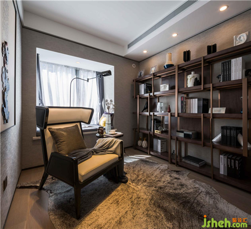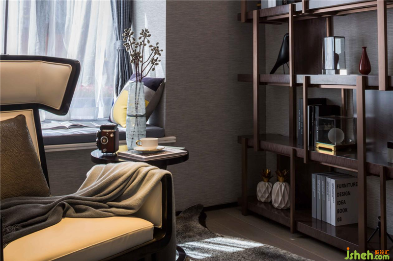 墻面以淺色墻紙為主,搭配淺色木地板,讓空間整體更加明亮,書架為深色增加一點厚重感。