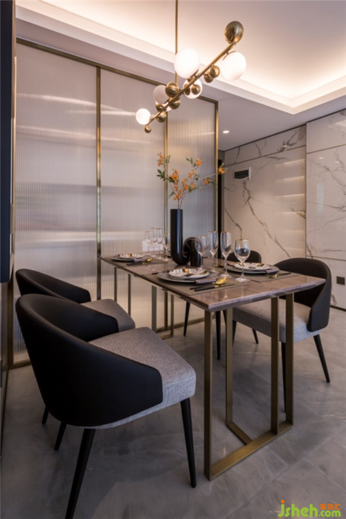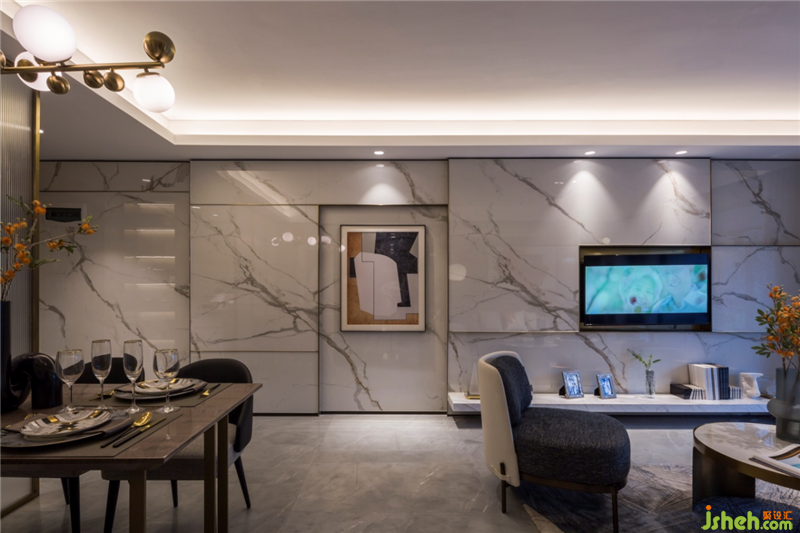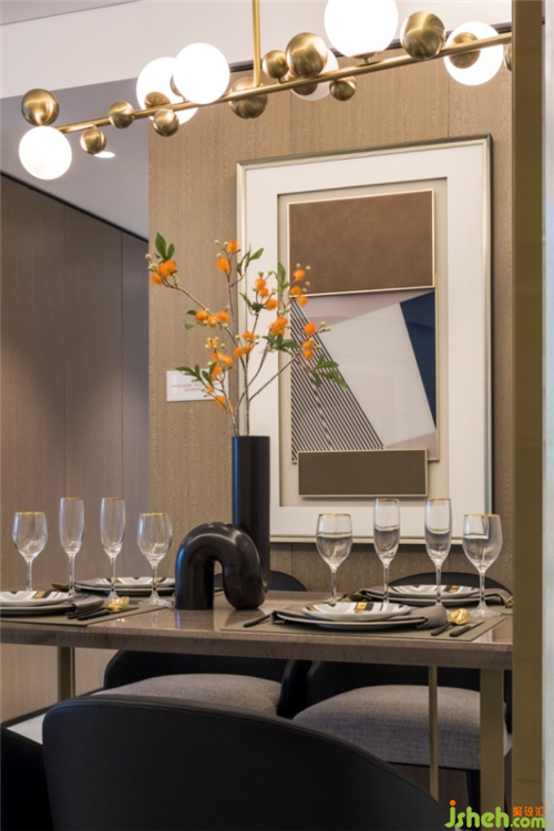 餐廳與客廳的協(xié)調(diào)共生,是歡聲笑語的延續(xù)。裝飾性的水晶吊燈以及極具感染力的藝術(shù)品帶來了靈動有趣的空間氛圍。當(dāng)飯香氤氳,一家三代暢談生活其樂融融。