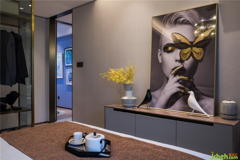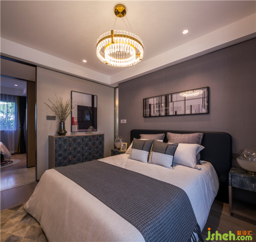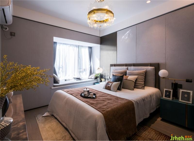 主臥延續(xù)了客廳的氛圍,整體深色的背景墻和灰色的地板,則能襯托出床鋪的簡潔輕奢感。黃銅的元素和灰色的布藝體現(xiàn)出了居住者對生活的熱愛和對品質(zhì)的追求。