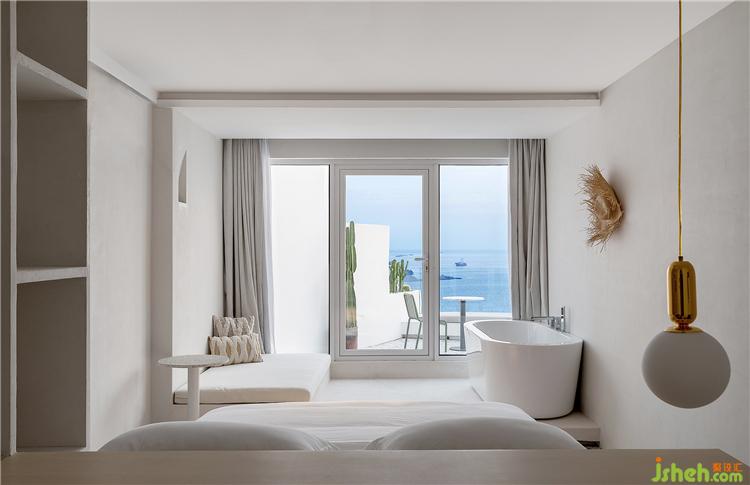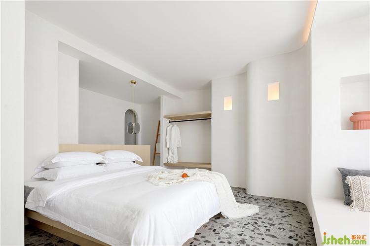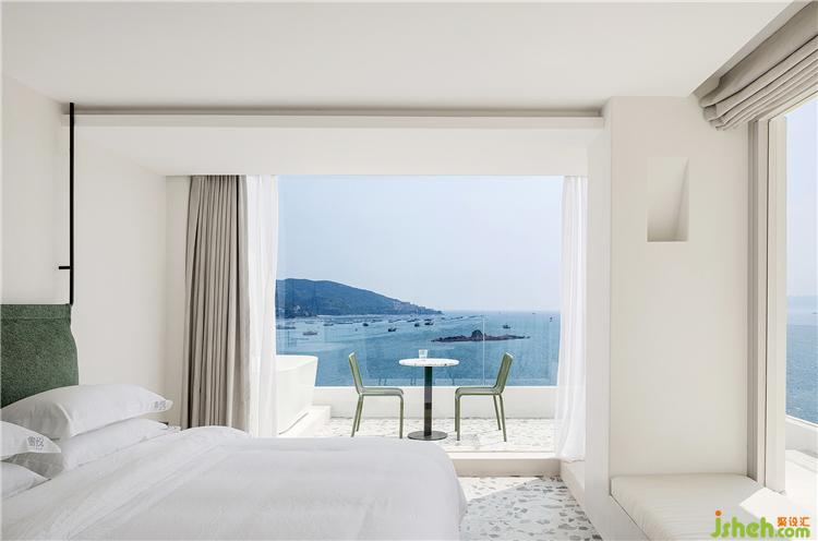 空間最大限度地將室外風(fēng)景引入室內(nèi),客房的每扇窗戶都被精心安排,朝向最美的視角開(kāi)設(shè),為來(lái)客細(xì)細(xì)收集這里的每一刻光景。透過(guò)細(xì)框落地窗遠(yuǎn)眺出去,清藍(lán)的海與山成了一幅框景,日出的璨斕、海浪的長(zhǎng)歌、晚霞的溫柔……空間將流動(dòng)而纏綿的自然詩(shī)意納入日常之中,予人安適舒愜之感。酒店設(shè)計(jì)