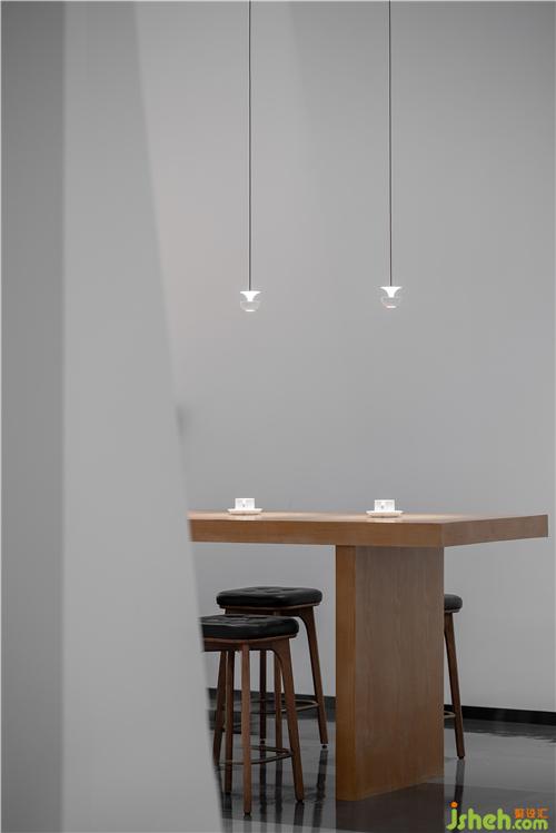 層高3.8米的線條感隔柵與垂直投射的陣列型吊燈相互映襯,演繹出摩登的當代設(shè)計美學。深度洽談區(qū)的長桌延伸至吧臺展示柜,體塊的交疊穿插塑造著獨特的雕塑感與戲劇趣味。