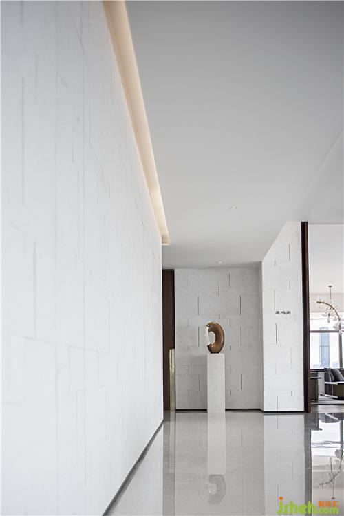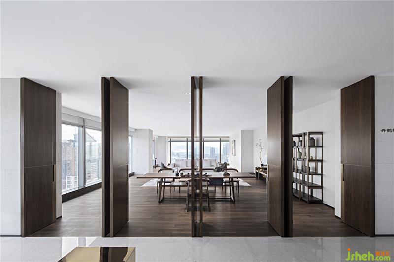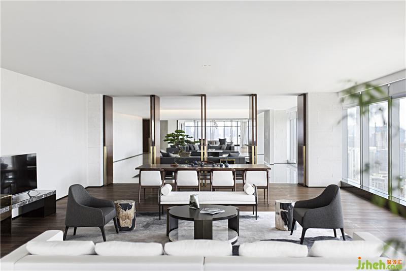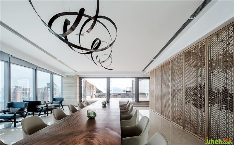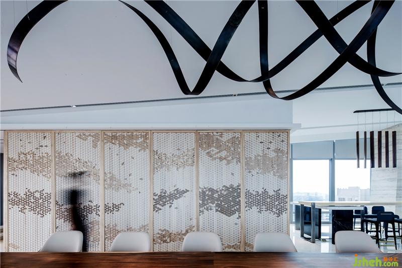 素樸的木藝,經(jīng)由現(xiàn)代工法的演繹,成為極具當代氣質(zhì)的墻面藝術裝置,搭配淺色調(diào)布藝沙發(fā)、水珠狀藝術燈飾,呈現(xiàn)出純粹而有序的空間氣度??臻g的純凈與窗外深圳的都市景觀形成對話,設計師以獨特的視角凝注天幕之上此時此刻的曼妙,予人以獨特的觀感。