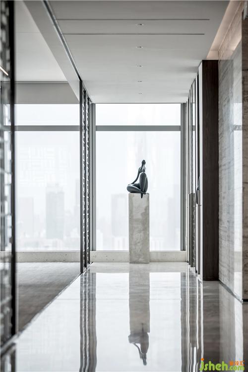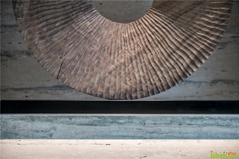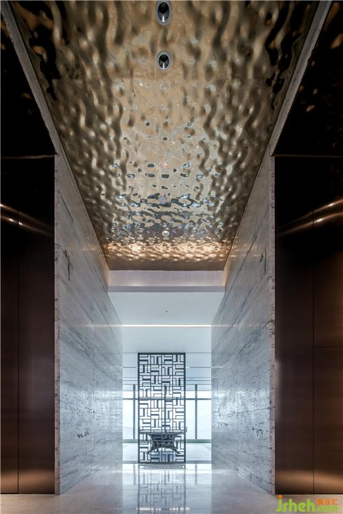 挑高天花上,是光影瀲滟的水波紋,與云紋墨痕的大理石墻面相互映襯,在樸拙與精細的對話中,寫意流動的藝術,描摹生動的意境。