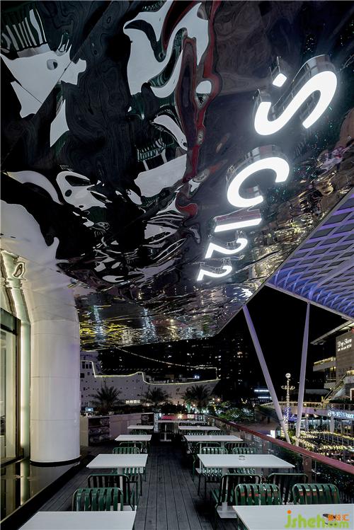 混凝土磚、鏡面、黃銅、藝術(shù)玻璃......埂上設(shè)計在材料選擇上,不僅僅考慮造價和純粹技術(shù)的因素,同時考慮情感體驗、藝術(shù)想象。餐廳西面擁有廣闊的觀景視野,搭配大面的落地玻璃,將自然引入空間,讓人眺望海上世界美麗的海景與夜景。