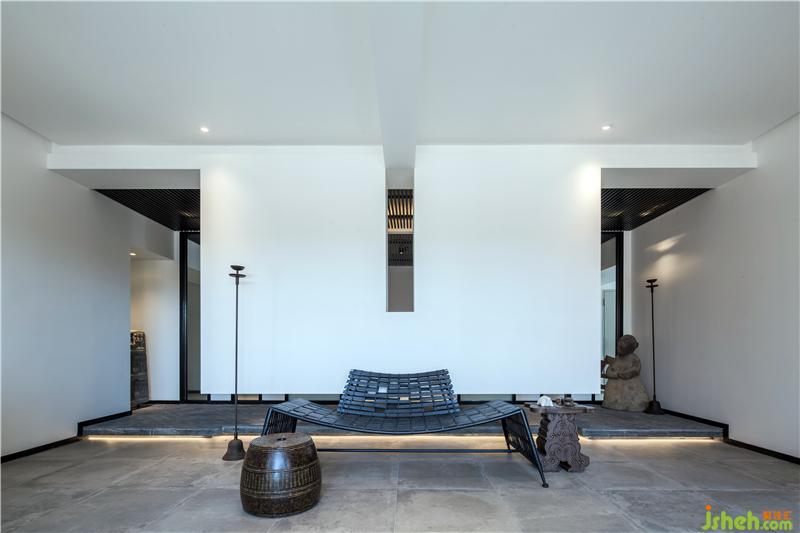 方圓之間,層疊的起伏勾勒出空間里的裊裊禪意;灑脫的大體塊挑出、懸空,面與面的有序梳理、重構(gòu)。這一切使得室內(nèi)的空間豐富且多元化,不同的形體關(guān)系營(yíng)造了不同光線下的氛圍、不同的體塊以及不同的功能。種種材質(zhì)融合于白墻,互不沖突,達(dá)到了和諧的平衡。