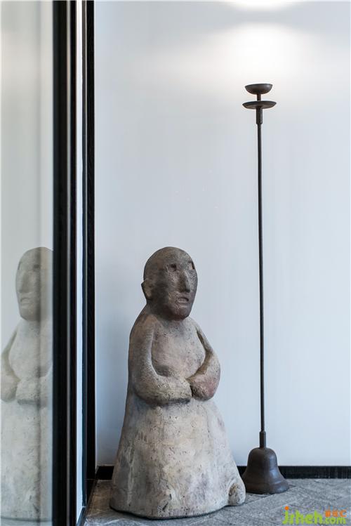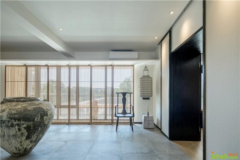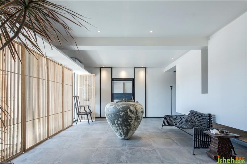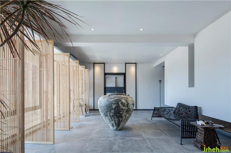 在這一方天地,扇扇淺木質(zhì)屏風(fēng),將明亮的光線過濾成斑駁闌珊的光影;古樸的深口大缸,在輕盈空間中壓下深沉的一筆,將視覺焦點(diǎn)和氣場(chǎng)濃縮凝聚在中央。古董雕塑肅穆而立,鐵藝燈籠墻邊低掛;烏木層疊秩序井然,綠意蔥蔥點(diǎn)綴其中。深藤淺麻,交織成趣;灰石青磚,古而不拙。是已,觀者漫步其中,步步皆景,禪意自如。
