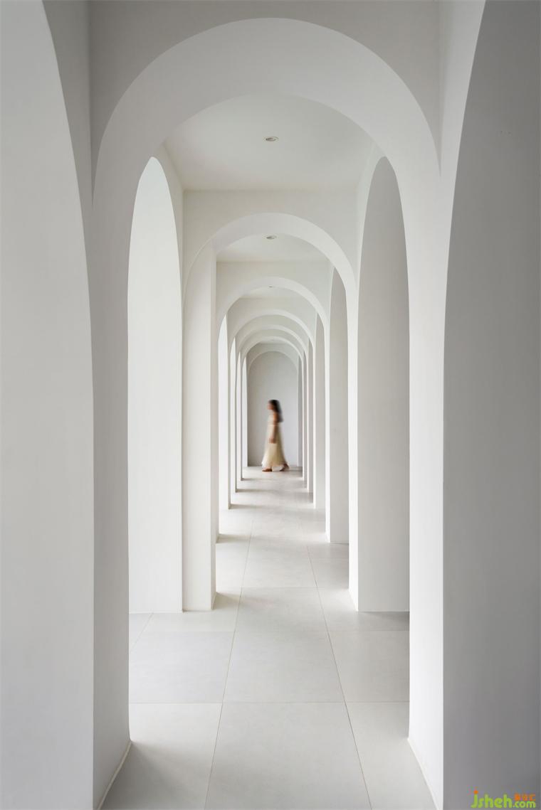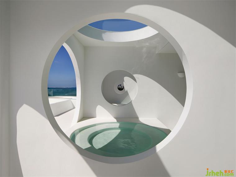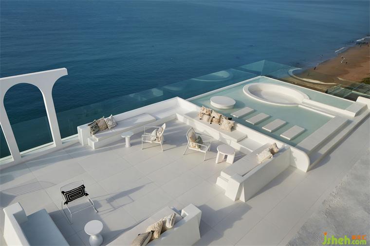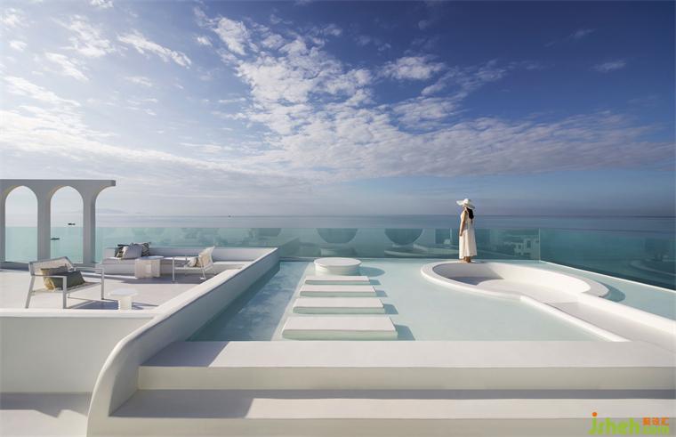 從無(wú)邊泳池延伸出去,精品酒店設(shè)計(jì)當(dāng)視線(xiàn)觸及純白與碧藍(lán)的無(wú)形銜接處,人的知覺(jué)和想象自然而然地轉(zhuǎn)移至天臺(tái)之上。