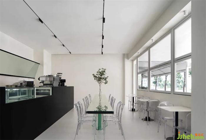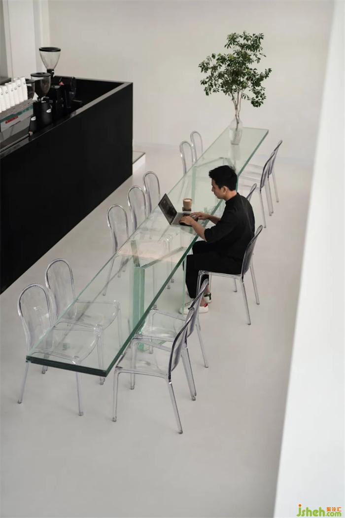 主空間中央的玻璃長桌,通體透明的硬朗形體透露著工業(yè)時代的冷峻與嚴(yán)謹(jǐn),味匠咖啡廳設(shè)計而亞克力椅子的柔和曲線中和了其中的疏離,使得人們共處方式更加開放多元。人們可以在這里視頻會議、活動交流,充分表達(dá)自我,聯(lián)通外部世界。