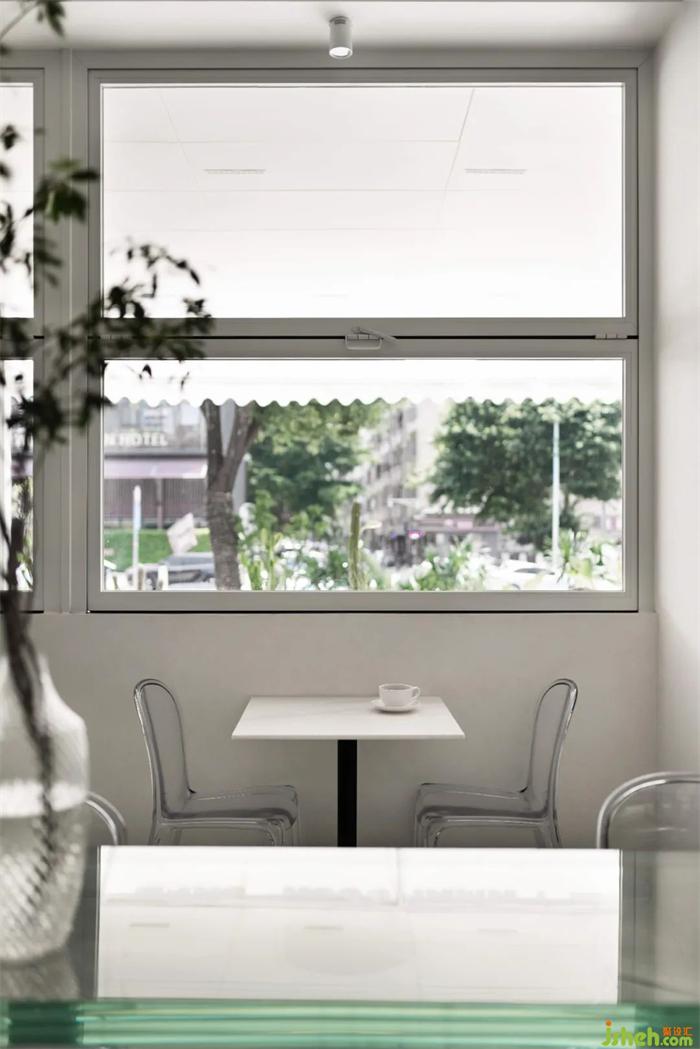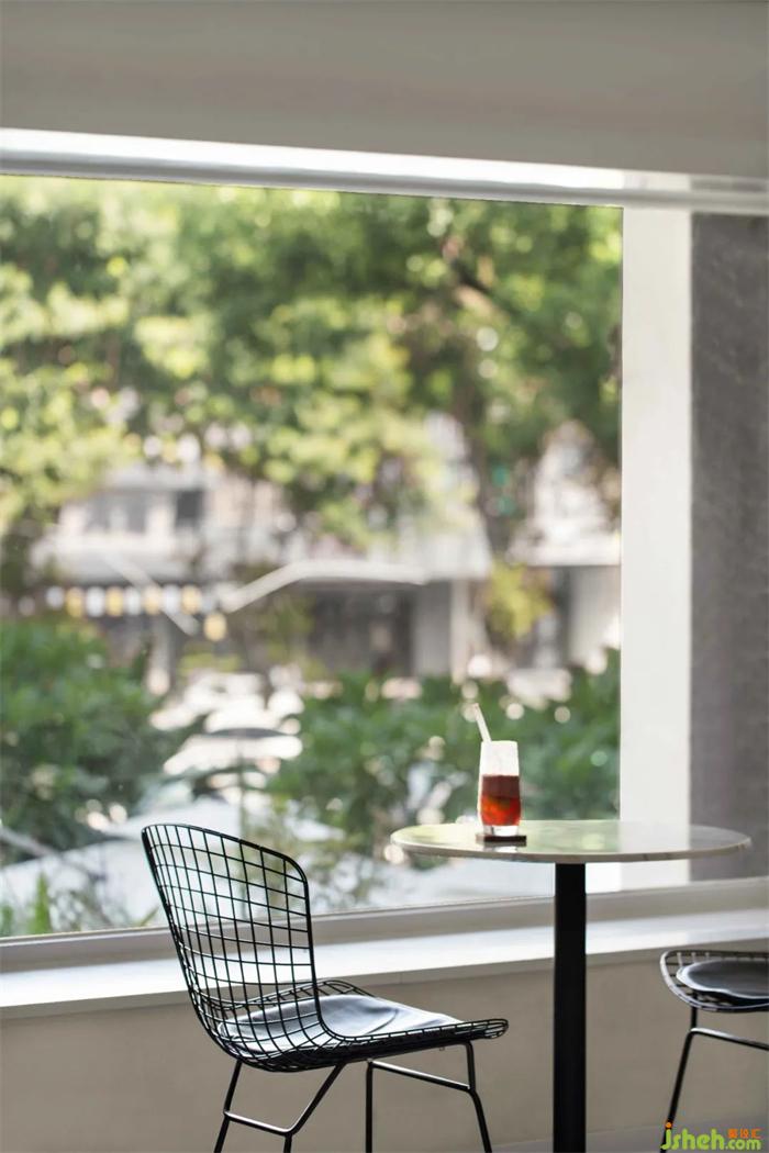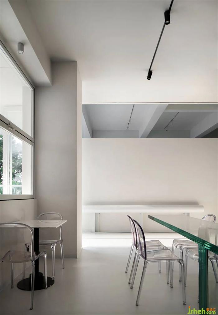 室內(nèi)空間以大面積的白色充斥兩個方盒空間的嵌套結(jié)合關(guān)系,并通過高差打造垂直緯度的豐富體驗(yàn)。對于當(dāng)代都市人群的生活預(yù)設(shè),咖啡不僅代表了一種生活態(tài)度,更是一種工作方式的延續(xù)。餐廳設(shè)計對于冗雜工作間的厭倦,使得人們轉(zhuǎn)向?qū)で蟾辛己皿w驗(yàn)的空間。