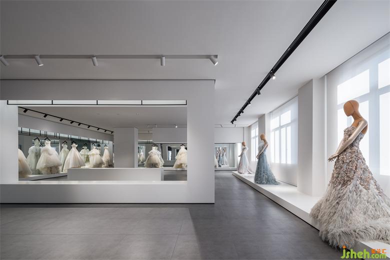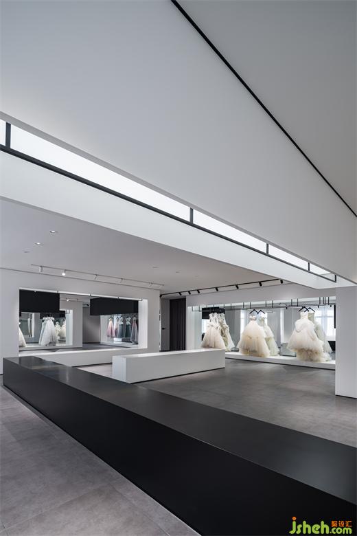 基于WANG FENG產(chǎn)品系列的婚紗和禮服兩大類別,禮服展廳設(shè)計(jì)使用空間體塊穿插的手法,自然勾勒出兩大展示體系的聚焦??v橫交錯(cuò)的體塊陣列,消解了傳統(tǒng)櫥窗展示的秩序,讓品牌更自由、更近人。