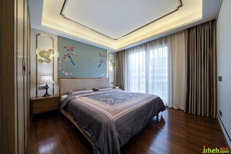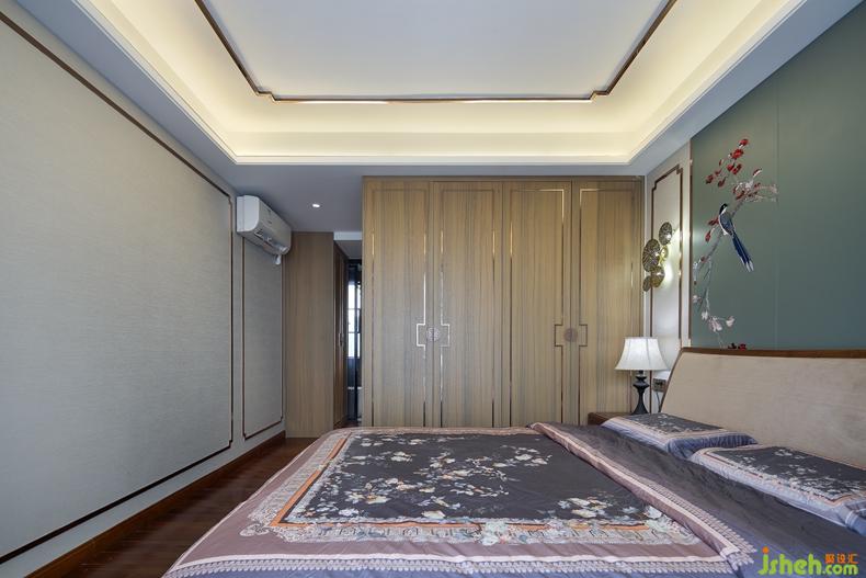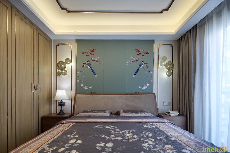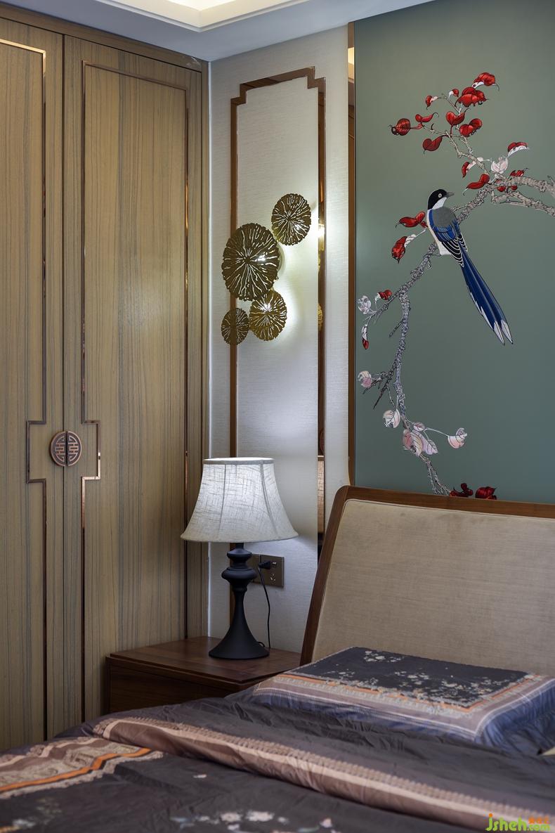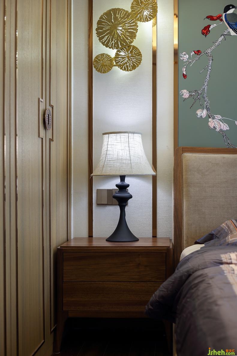 臥室的搭配也大有講究,古典的中式審美無處不在,對稱、花鳥工筆畫、荷葉燈飾、中式框和諧淡雅的整體配色,甚至衣柜的把手等等,饒是如此,卻也不會過于拘束。