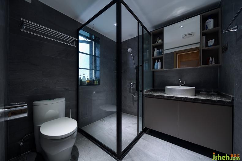 衛(wèi)生間黑白灰的色彩高級神秘猶如黑珍珠的光芒一樣深邃,深圳室內(nèi)設(shè)計師用玻璃隔開洗浴、洗漱臺以及馬桶,整個規(guī)劃充分利用了每一寸面積。