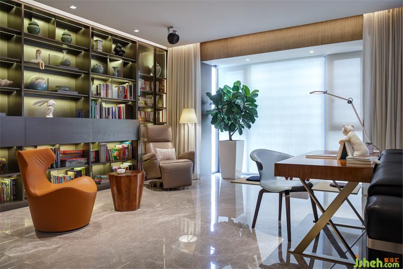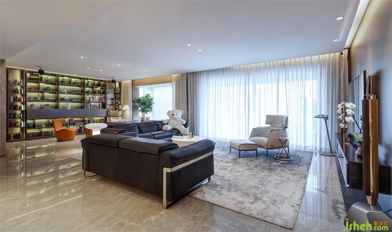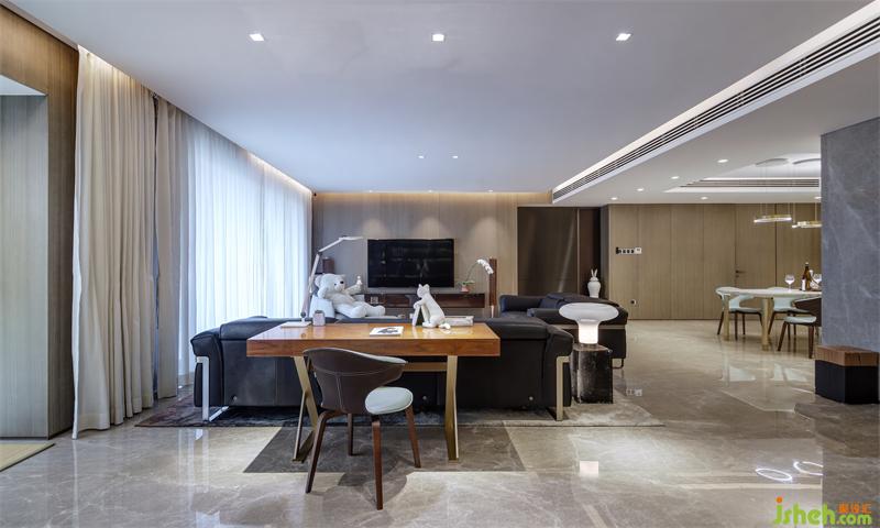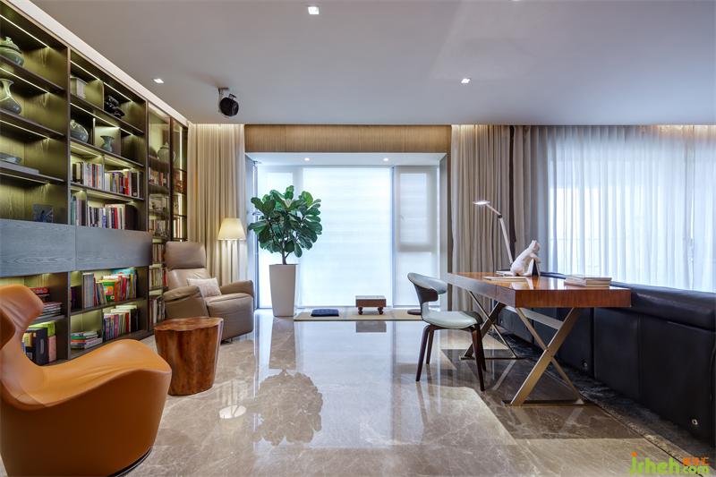 為開闊空間,設(shè)計師改造原始結(jié)構(gòu),將書房與客廳打通,拉伸了客廳的整體空間。