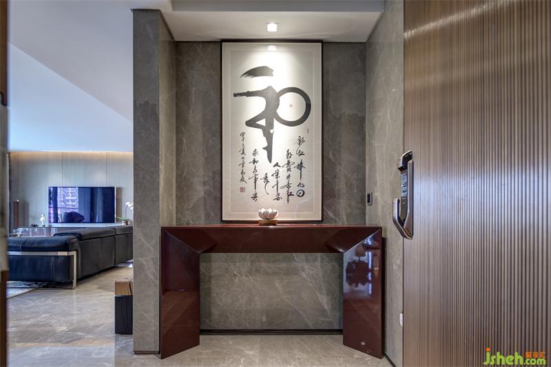 設(shè)計師將入戶玄關(guān)以簡約大氣為宗旨進行設(shè)計,整面墻體鋪設(shè)灰色大理石,玄關(guān)燈下以“和”為主題的書法畫映入眼簾,彰顯了主人“禮之用,和為貴”的行事準(zhǔn)則。