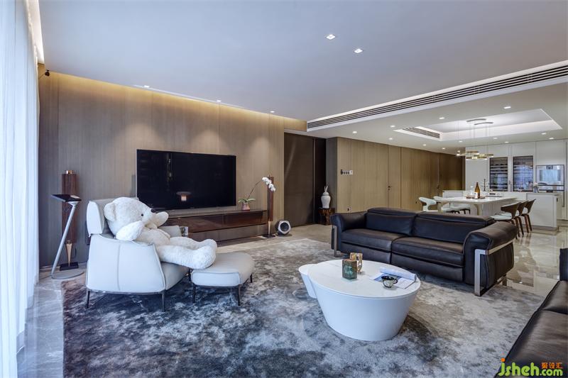 客廳三分之二的區(qū)域用作休閑娛樂及會客區(qū),大面積灰白扎染花色的羊毛地毯大致勾勒出區(qū)域輪廓,兩組由不銹鋼條支撐的純意大利進口真皮沙發(fā),觸感柔軟舒適,彈性適中,忙碌了一天后坐上真皮沙發(fā),疲憊便卸下了。