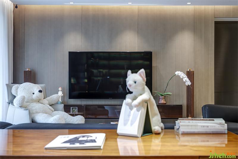 電視背景墻選擇木質(zhì)貼面,希望業(yè)主在休閑娛樂時的觀影環(huán)境更加柔和放松,大屏顯示器及棕色木質(zhì)電視柜懸掛在上,隱藏線纜圍繞極簡的主旨,便于清潔。兩側(cè)金屬立式音響相較傳統(tǒng)音響頗具設(shè)計感。