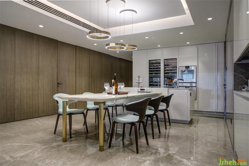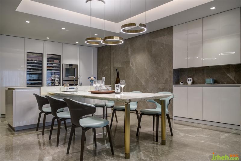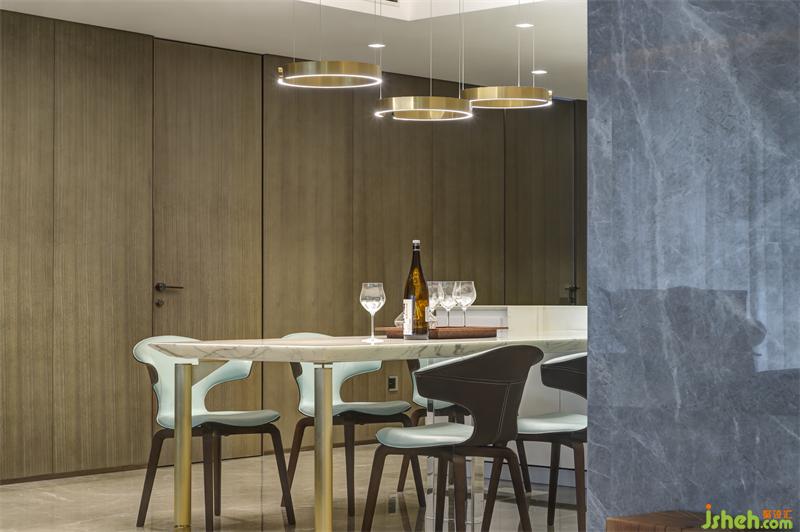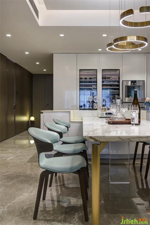 餐桌選擇六座西式餐桌,采用白色大理石臺面和金色啞光噴漆桌腿,搭配霧霾藍皮質(zhì)餐椅,整體清新淡雅的色調(diào)使畫面明亮整潔,深圳豪宅設(shè)計照明采用與桌腿相呼應(yīng)的啞光金屬不閉合環(huán)形吊燈,三燈錯落有致。一側(cè)的內(nèi)嵌式水吧和儲物柜滿足儲物和生活需求。