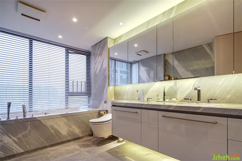 深圳豪宅設(shè)計師采用與墻體及地面一體設(shè)計的浴缸及懸掛馬桶,貫徹極簡的設(shè)計風(fēng)格,避免了難以清潔的尷尬,更能保證衛(wèi)生。