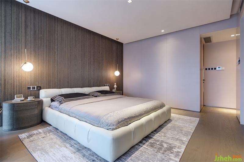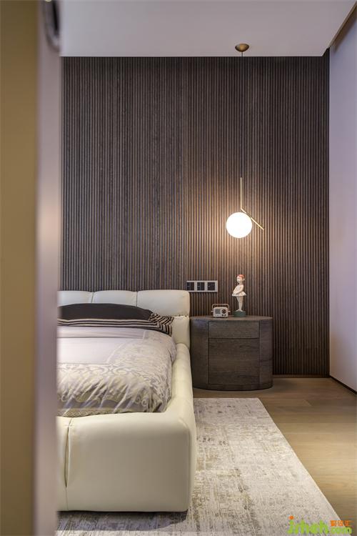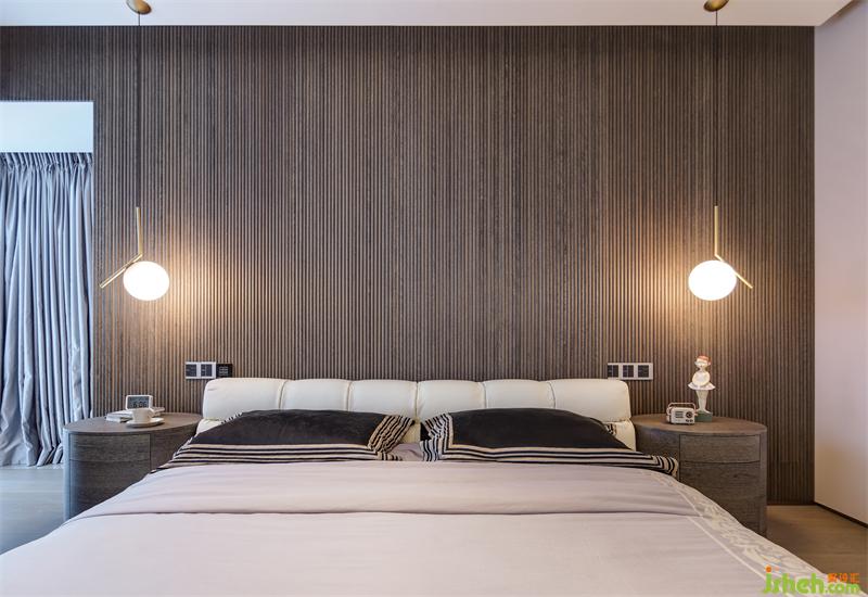 黑灰色細條紋酸枝木貼面墻前對稱的窗前吊燈及床頭柜配色統(tǒng)一而不乏味,球形吊燈適用臥室柔和的整體氛圍需求,雙聯(lián)開關設計避免了主人日常起居不必要的麻煩。