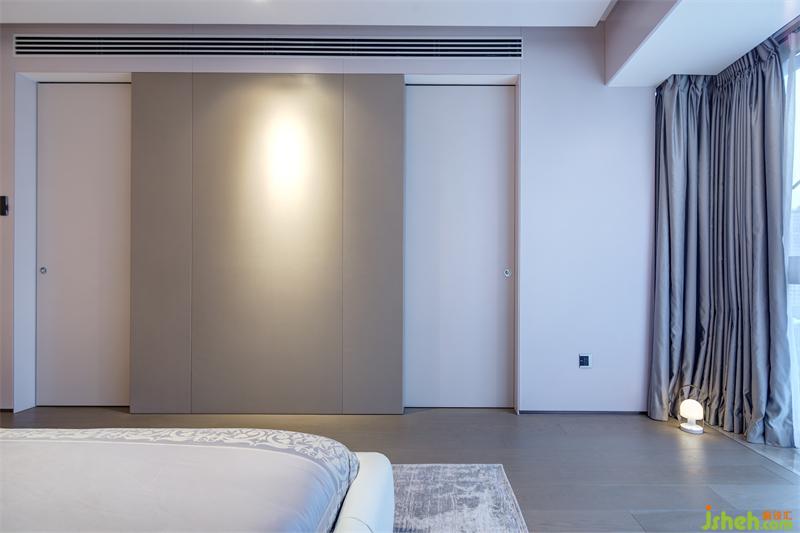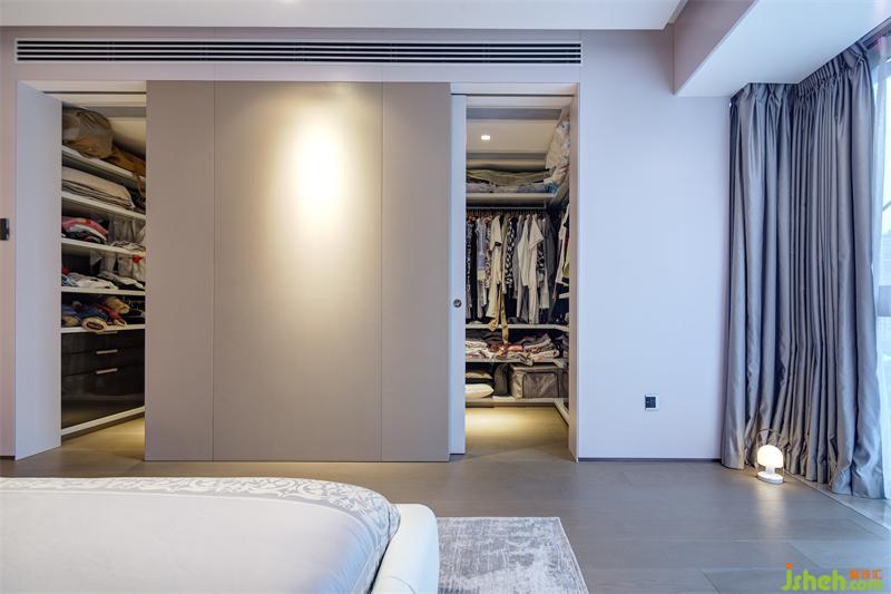 衣帽間直接連接主臥,設計隱藏式推拉門分隔臥室和衣帽間,三面環(huán)繞的儲物柜便利了主人的每日穿搭,也為主人的服飾、箱包及床品等生活用品提供了儲存空間。