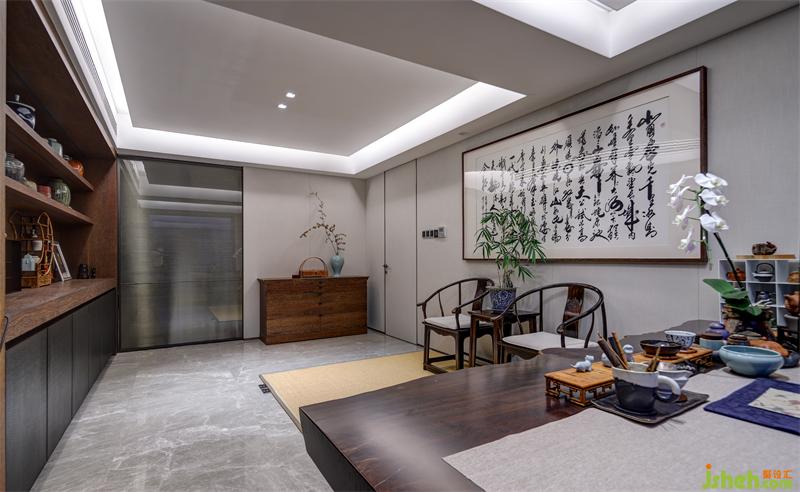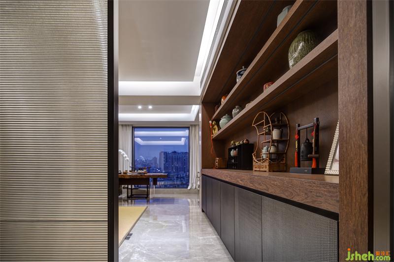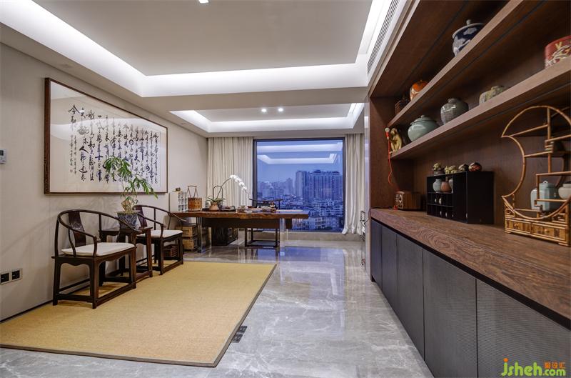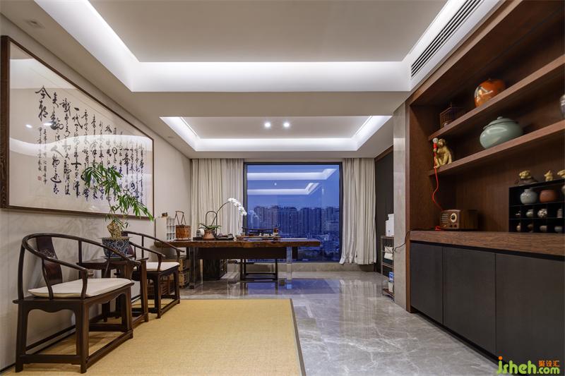 拉絲玻璃作為茶室與走廊的隔斷既保證了隱蔽性又不顯拘束,茶室內大面積采用草木元素,適應書房的整體調性。設計師在一側墻面設計展示柜,希望將業(yè)主的各式工藝收藏品得以展示,與對側墻面懸掛的大幅書遙相呼應,彰顯主人品味。草編地毯上的檀木太師桌椅與落地窗前的寫字桌適合主人伏案工作,也適合與三兩客人商談閑聊。
