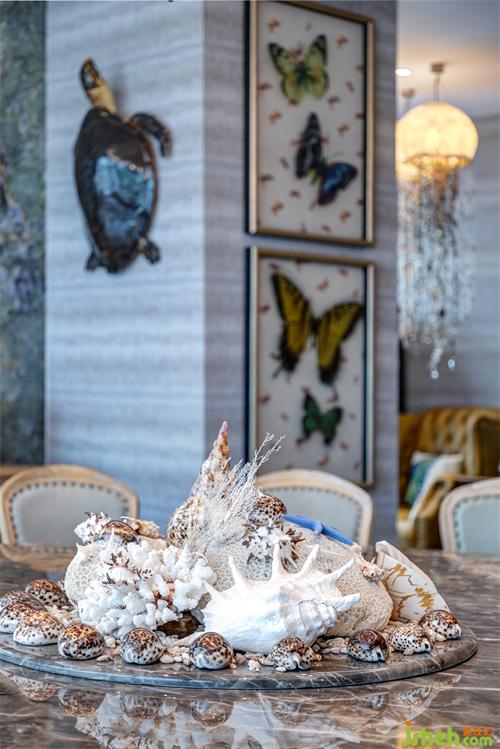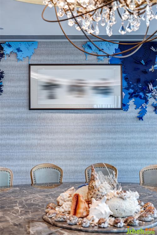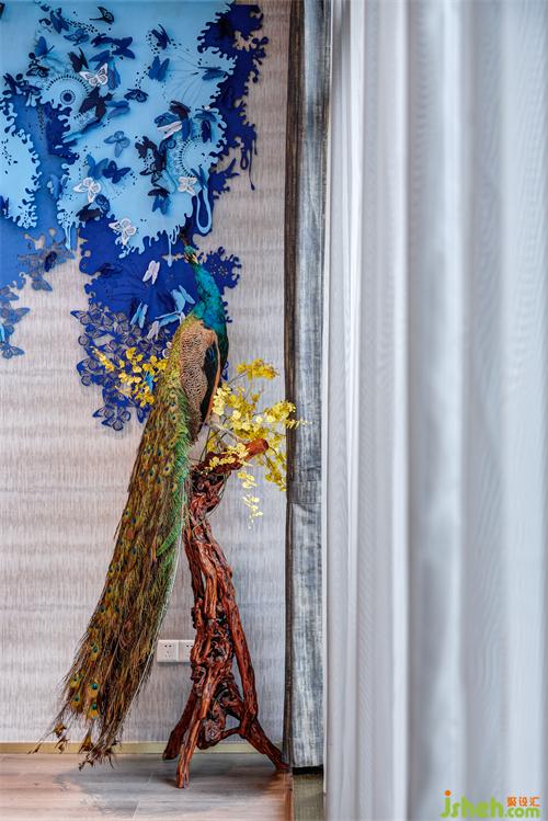 明朝的呂紀(jì)有一幅名畫《杏花孔雀圖》,描繪了孔雀長(zhǎng)尾垂地,棲息引頸張望,而一旁的古杏正開(kāi)得熱鬧,深圳辦公室設(shè)計(jì)花枝交相輝映的美況。我們將古畫的美還原出來(lái),讓空間多了幾分古色古香的意蘊(yùn)。配合墻上的藍(lán)色蝴蝶裝飾物,更添幾分詩(shī)意韻味。