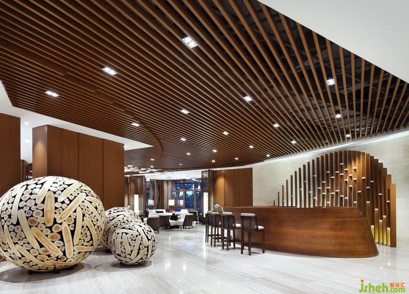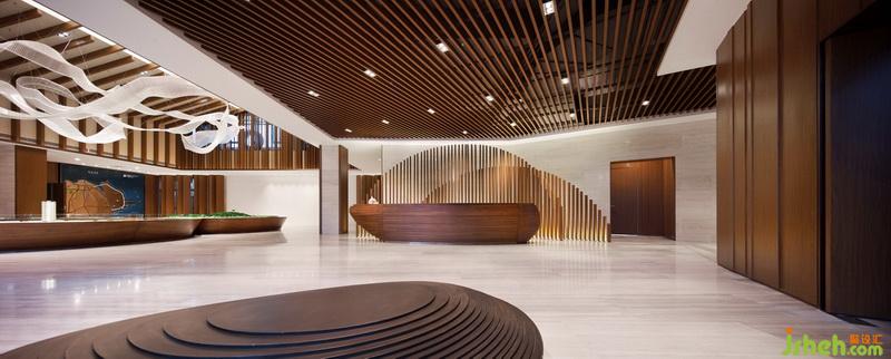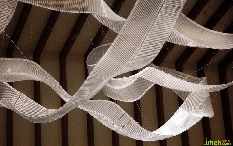 在表現(xiàn)空間的過程中,“況陽春召我以煙景,大塊假我以文章”成為設計方在表現(xiàn)形式上的指導思想。在平面布局注重空間的開合關系,在空間效果上則注重建立一個大與小,疏與密,繁與簡相對應,有節(jié)奏感的空間秩序。因此室內設計師在建立室內空間秩序的同時,利用一條可塑材質創(chuàng)作的裝置在大堂中央部分形成舞動的狀態(tài),打破空間因對稱的平衡和材質的秩序感可能造成的呆滯感,由視覺的層面產(chǎn)生靈動的感受。它是整部樂曲中需要流露的靈魂。