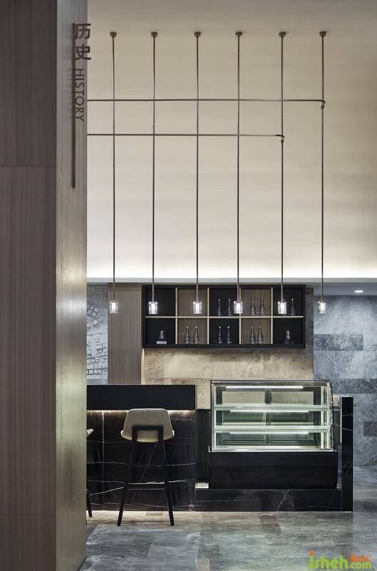 主要材料:木飾面、拼色古堡灰大理石、劈開磚、古銅色不銹鋼、黑色氟碳漆