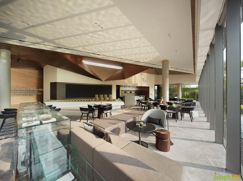 設(shè)計(jì)師認(rèn)為從一個(gè)面延伸出兩條路可以走——由天花這個(gè)面,往外則與戶外自然環(huán)境和景觀相銜接;向內(nèi)則成為整個(gè)空間中吸引人注意的部分,從而使之成為一條起伏流暢的設(shè)計(jì)線索貫穿整個(gè)空間。