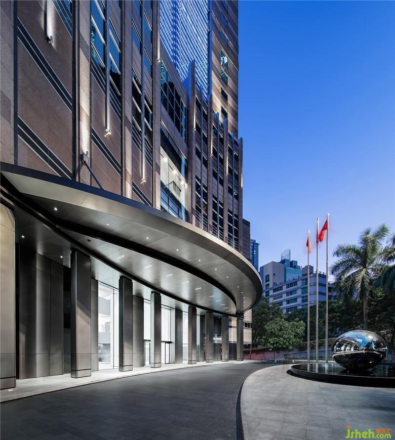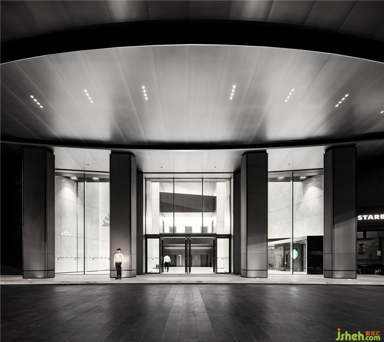 立柱之上雨篷則被重新設計,簡潔的弧形結構替代了原本的玻璃雨篷,結構的簡化讓它與大廈主體間的銜接更加自然,融為整體。同時,半圓弧形結構向兩側的自然延伸帶來了更多的覆蓋面,為遮擋功能帶來提升。