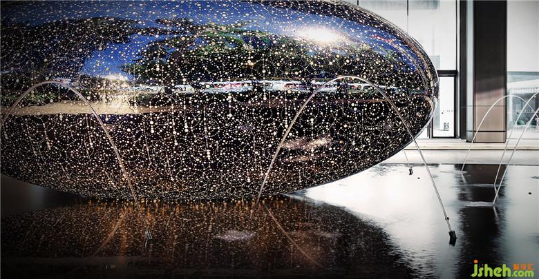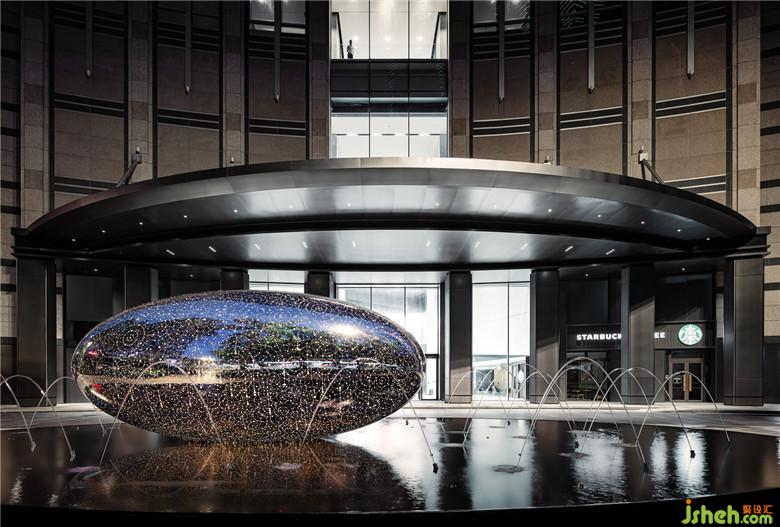 一樓大堂門前的巨蛋雕塑,源自藝術家Lindy Lee,6米不銹鋼材質的體量感,不容忽視,通體布滿細小的孔,黑暗中,它們會穿透蛋殼,投射出星辰般的光芒,讓人看到有無限的能量在迸發(fā)。如果說這棟大廈曾是一個過往的城市象征,那經歷過重塑后的它,應當是“孕育”在蛋殼的一束光芒,繼續(xù)點亮門前這條大道。