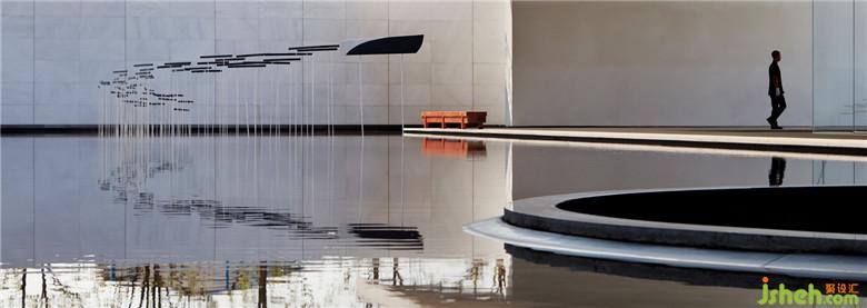 穿過連接前廳與后廳的連廊,一簇枝椏立于水面,身旁墻面素凈,背后天空寂遼,不大的天地方寸間卻為它留下了的無限的空白與想象,在水面的倒影里彷佛有寂靜的詩意在低語。