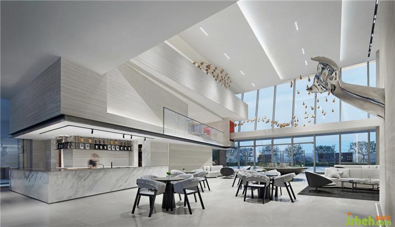 延續(xù)建筑輕盈、現(xiàn)代的語匯,設(shè)計以“海、天、云”這種在地的自然形態(tài)作為出發(fā)點,在空間內(nèi)部運用堆砌、切割、錯置空間體塊等內(nèi)建筑概念手法,切入簡潔而富有創(chuàng)造性的輕盈體塊,在線條與體面關(guān)系上不撕裂建筑形態(tài)的基礎(chǔ)上,將建筑舒緩地延伸進室內(nèi)。原質(zhì)材料的白與輕度灰金屬在不同的光線變化中表達出“海、天、云”的情態(tài)關(guān)系,從而形成建立整個空間秩序的設(shè)計線索。