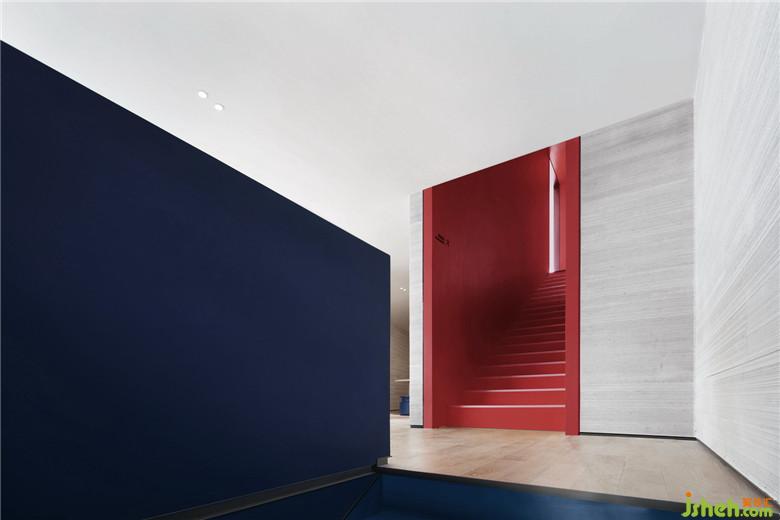 在二層洽談區(qū),我們通過增加夾層樓梯空間連接了三層的兒童活動區(qū)與咖啡吧,并與開放式的戶外屋頂結(jié)構(gòu)一同作為一種開放式櫥窗形態(tài)展示給來者。同時,為平衡空間整體灰白主色調(diào)營造的過于空曠的觀感,在二層及三層的多個區(qū)域,我們以獨立的大塊面紅、藍原色作為空間調(diào)節(jié),通過墻體前后塊面的錯落與色彩搭配,使空間層次得到豐富。