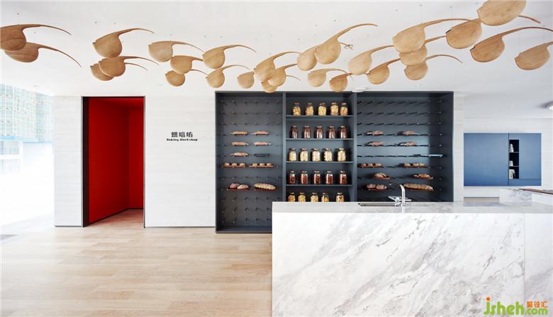 在此基礎(chǔ)上,軟裝增加了相對具象的藝術(shù)造型加強空間對心理層面的暗示,同時回應(yīng)陽江海濱城市的地域特性——游動的魚群,從情態(tài)上既意味著海洋,賦予了空間一種“活”的體態(tài),也是空間動線流向的一種指引。大型海豚及海浪造型裝置的安排,則釋放出影響參觀人士應(yīng)有的氣定神閑,悠游的意味。